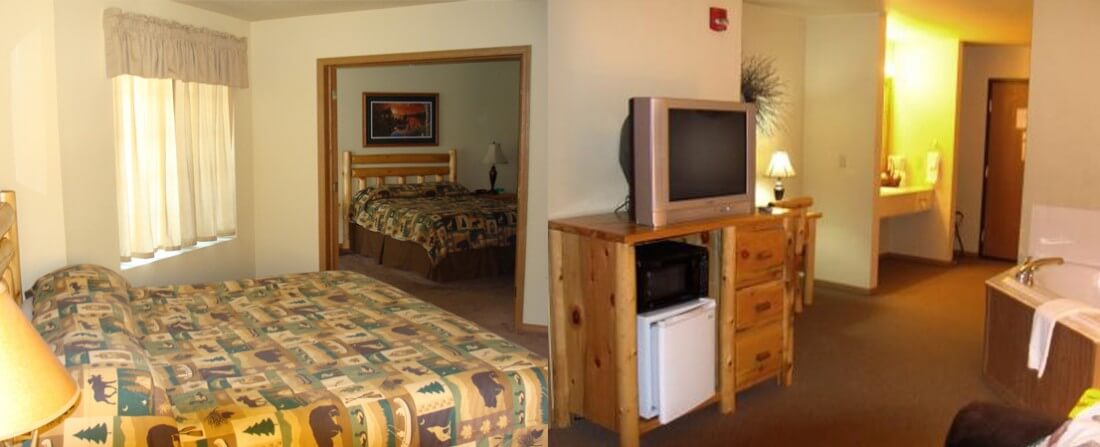 Queen Whirlpool Suite Our Queen Whirlpool Suite (QWS) includes a Queen bed, Sleeper Sofa, TV, Fridge, Microwave and a huge corner Whirlpool. The Hunting Suite, max of 5 people.